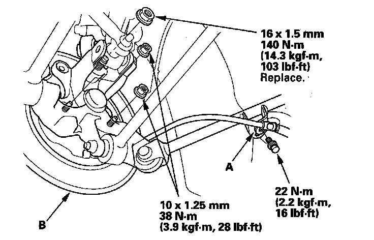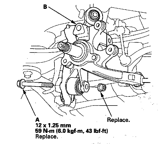 13. Remove the lower arm mounting bolt (A), then remove the knuckle (B).