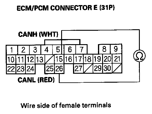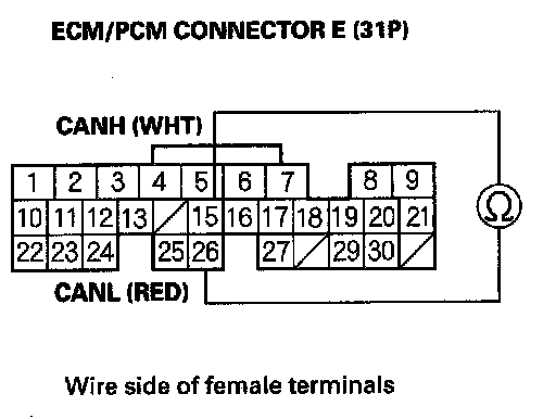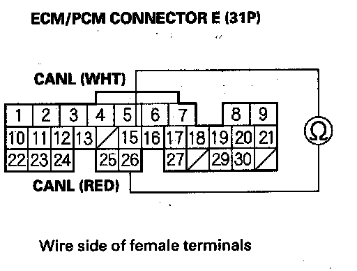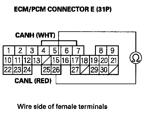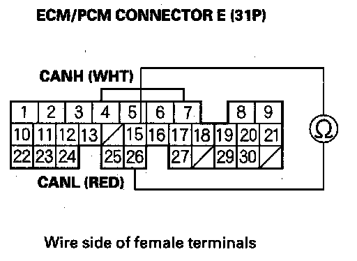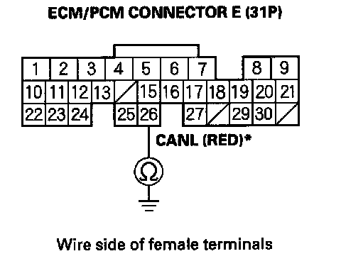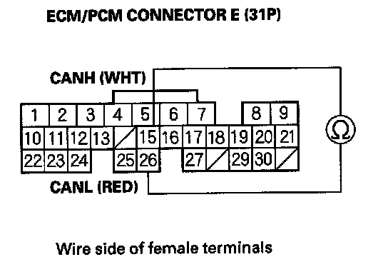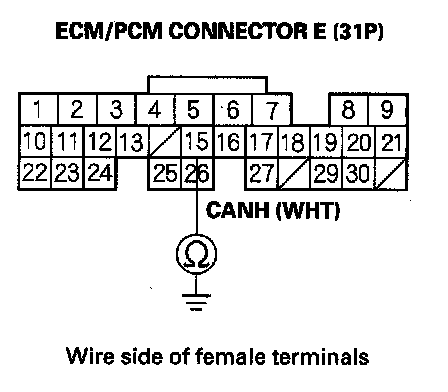 31. Measure resistance between ECM/PCM connector terminals E15 and E26*.