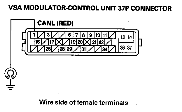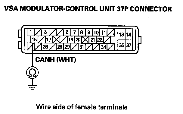 14. Check for continuity between VSA modulator-control unit 37P connector terminal No. 15 and body ground.
