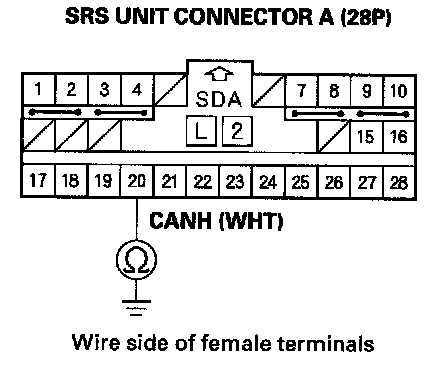 15. Check for continuity between SRS unit connector terminal A20 and body ground.