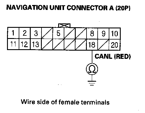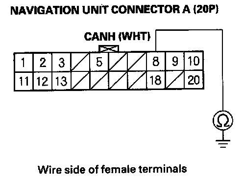 16. Check for continuity between navigation unit connector terminal A8 and body ground.