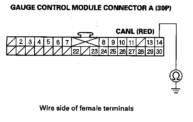 21. Check for continuity between gauge control module connector terminal A14 and body ground.