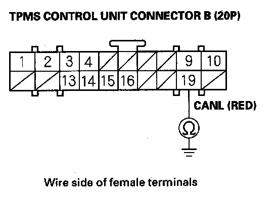 17. Check for continuity between TPMS control unit connector terminal B19 and body ground.