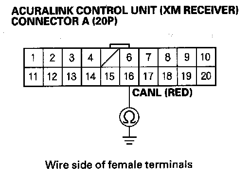 18. Check for continuity between AcuraLink control unit (XM receiver) connector terminal A6 and body ground.