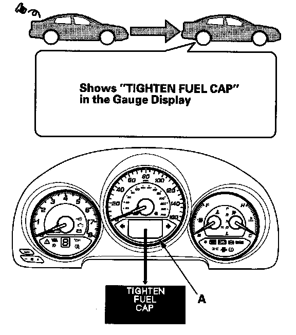 The first time a leak is detected a "TIGHTEN FUEL CAP" message in the gauge display (A). To scroll to another message, press the select/reset button. The "TIGHTEN FUEL CAP" message will appear each time you restart the engine until the system turns the message off. Turn the engine off then replace or tighten the fuel fill cap until it clicks at least once. The message should go off after several days of normal driving after the fuel fill cap has been tightened or replaced.