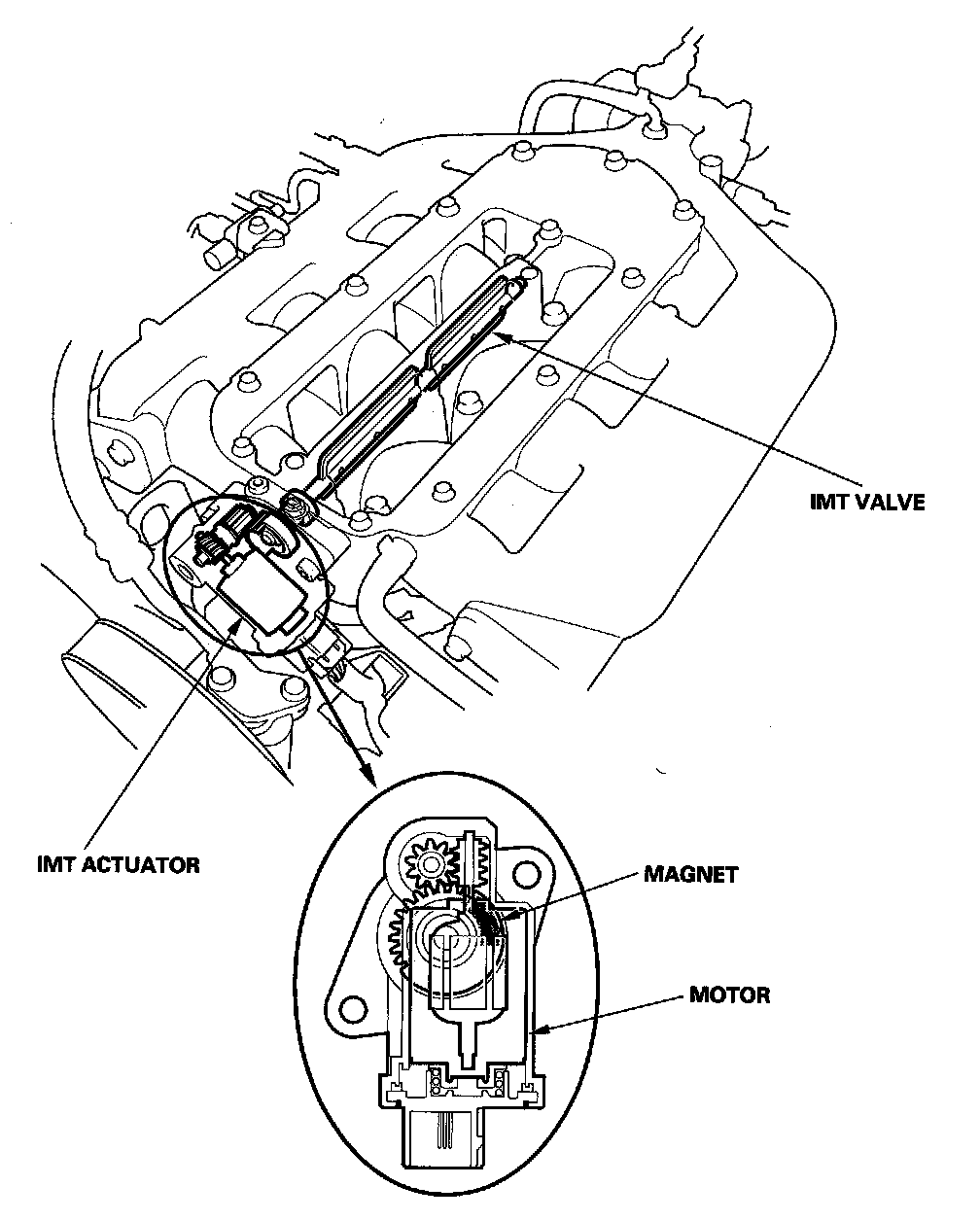 Intake Manifold Tuning (IMT) Valve SystemEngine power is adjusted by opening and closing the intake manifold tuning (IMT) actuator. When the valve is closed, there is high torque at low engine speed. When the valve is open, there is high torque at high engine speed. The intake manifold tuning (IMT) valve actuator has a sensor that detects the IMT valve position and sends the position signal to the ECM/PCM.