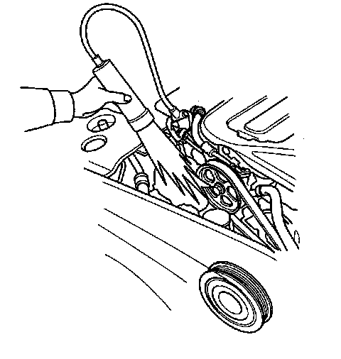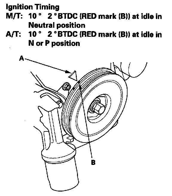 10. Aim the light toward the pointer (A) on the timing belt cover. Check the ignition timing under a no load condition, (headlights, blower fan, rear window defogger, and air conditioner are turned off).