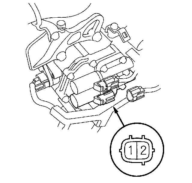 21. Connect a jumper wire from the negative battery terminal to A/T clutch pressure control solenoid valve B connector terminal No. 2, and connect a jumper wire from the positive battery terminal to connector terminal No. 1. Make sure A/T clutch pressure control solenoid valve B moves.