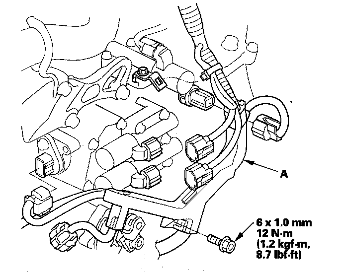 17. Disconnect the connectors from A/T clutch pressure control solenoid valves A, B, the solenoid harness, the transmission range switch, the ATF temperature sensor, the output shaft (countershaft) speed sensor, the input shaft (mainshaft) speed sensor, the 3rd clutch transmission fluid pressure switch, and the 4th clutch transmission fluid pressure switch.