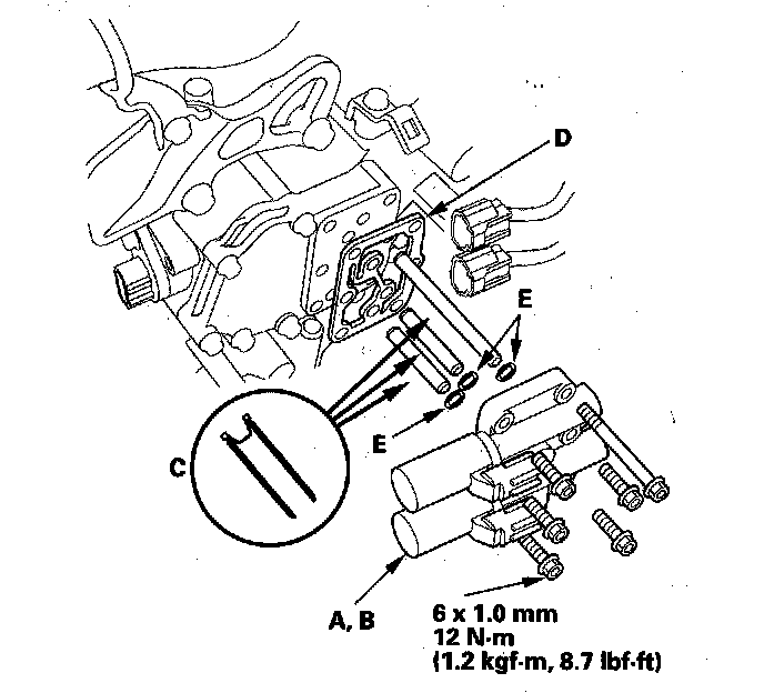 19. Remove A/T clutch pressure control solenoid valves A and B, the ATF pipes (C), the gasket (D), and the O-rings (E).