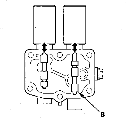 22. Disconnect one of the jumper wires and check the valve movement at the fluid passage in the valve body mounting surface. If the valve binds or moves sluggishly, or if the solenoid valve does not operate, replace A/T clutch pressure control solenoid valves A and B.