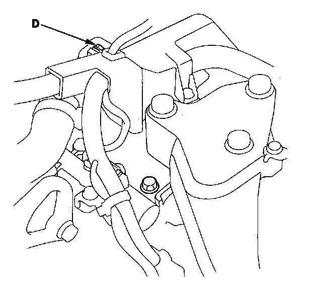13. Remove the intake air duct and the air cleaner assembly, and connect the A/T oil pressure gauge to the 2nd clutch pressure inspection port (D). Then temporarily install the air cleaner assembly and the intake air duct.