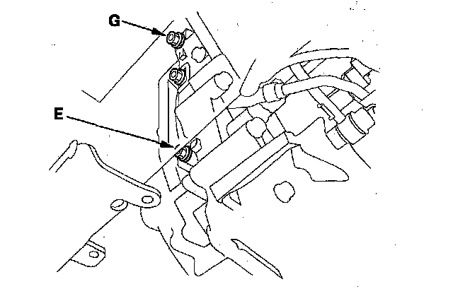 19. Connect the A/T oil pressure gauge to the 3rd clutch pressure inspection port (E) and the 5th clutch pressure inspection port (G).