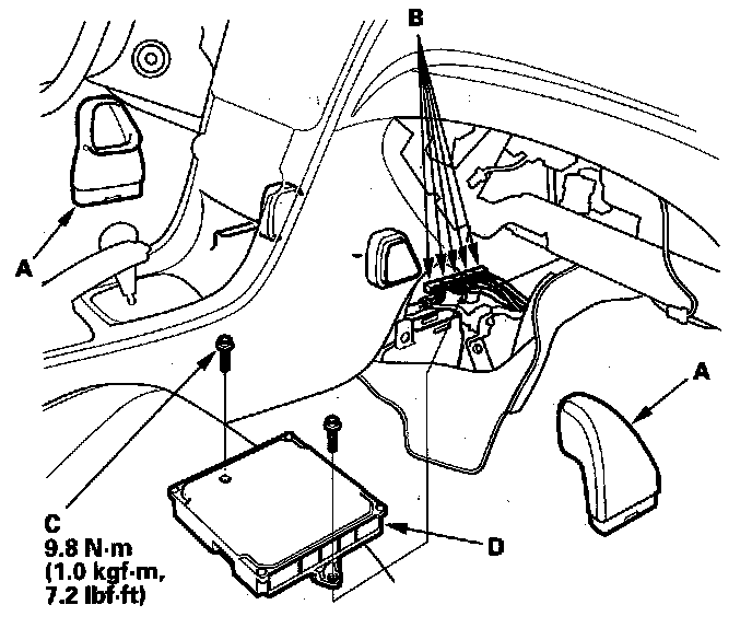 13. Remove the bolts (C), then remove the ECM/PCM (D).