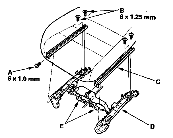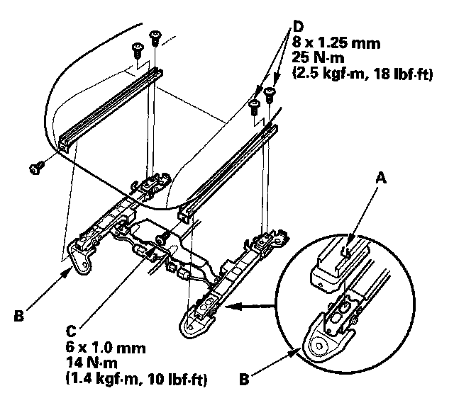 1. Install the new front passenger's weight sensors with tamper-resistant 6 mm TORX bolts (C) and 8 mm TORX bolts (D) under the seat track.