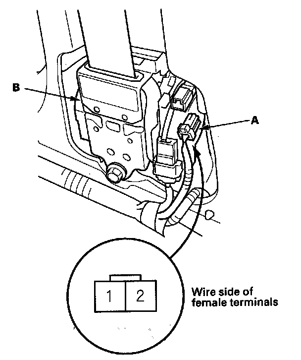 2. Disconnect the 2P connector (A) from the seat belt tension reducer (B).