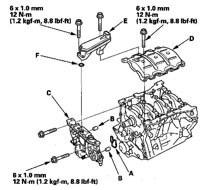 Install the dowel pins (B), then align the inner rotor with the crankshaft and install the oil pump (C).