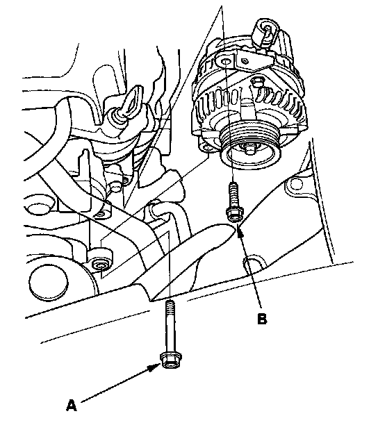 8. Remove the mounting bolt (A) and alternator bracket mounting bolt (B), then remove the alternator.
