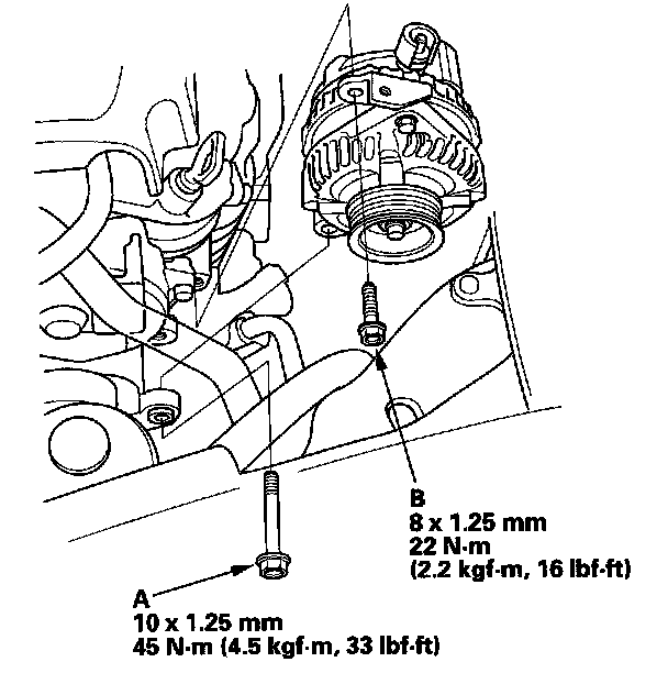 1. Install the alternator, then tighten the mounting bolt (A) and alternator bracket mounting bolt (B).