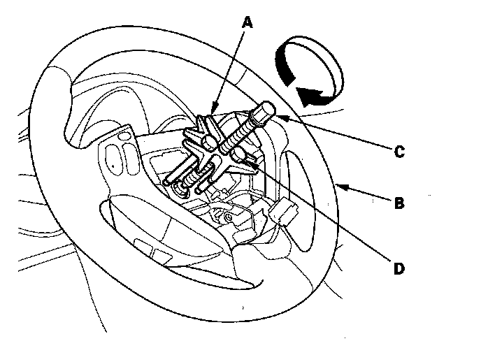 6. Install a commercially available steering wheel puller (A) on the steering wheel (B). Free the steering wheel from the steering column shaft by turning the pressure bolt (C) of the puller.