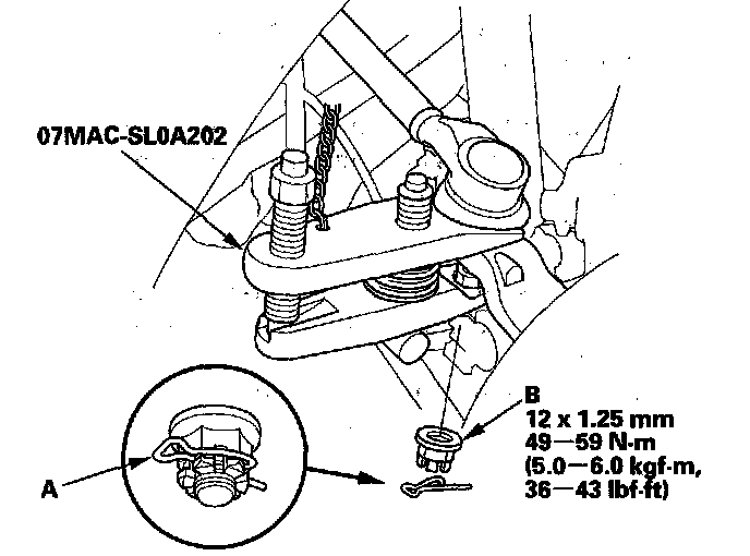 4. Remove the lock pin (A) from the upper arm ball joint, then remove the castle nut (B).