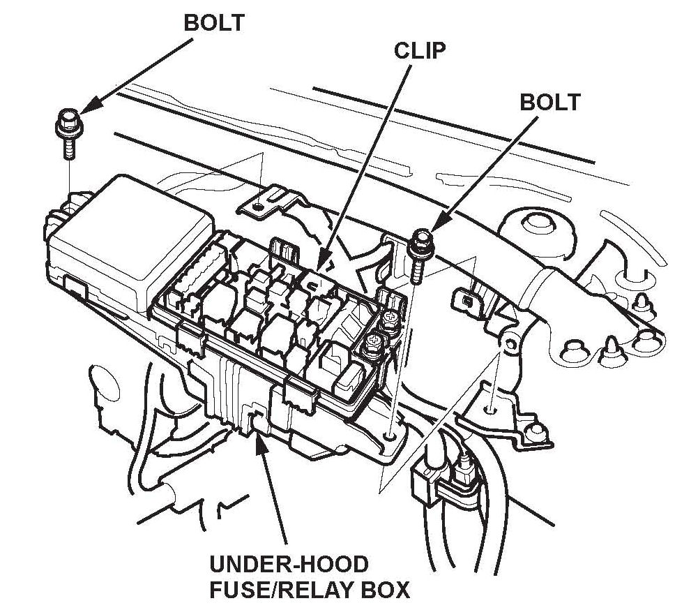 5. Remove the two bolts from the under-hood fuse/relay box, then detach the fuse/relay box from the strut brace bracket.