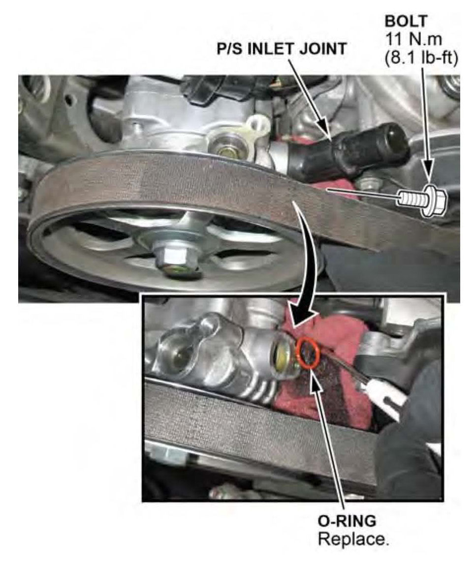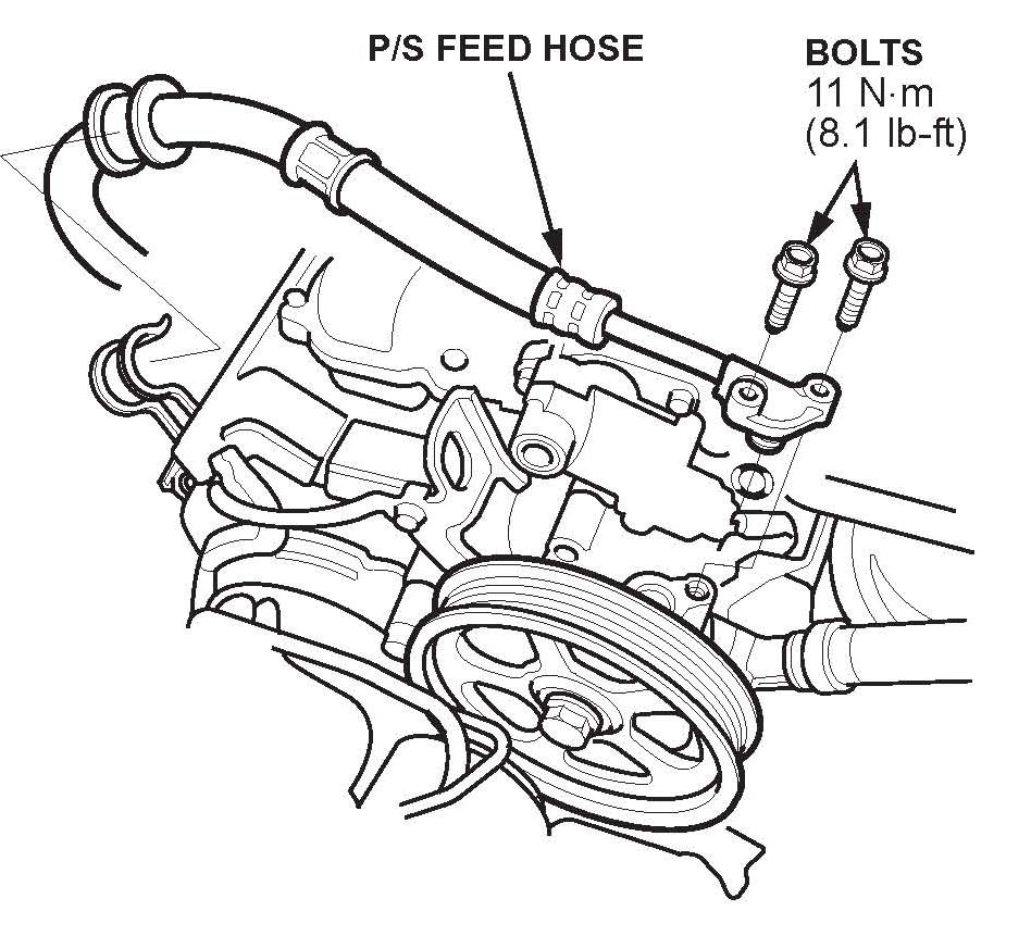 ^ Torque the P/S pump feed hose bolts to 11 N.m (8.1 lb-ft).