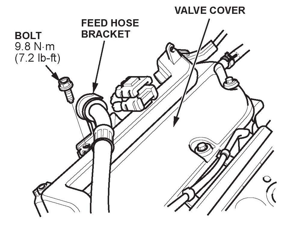 ^ Torque the feed hose bracket on the rear cylinder head cover to 9.8 N.m (7.2 lb-ft).
