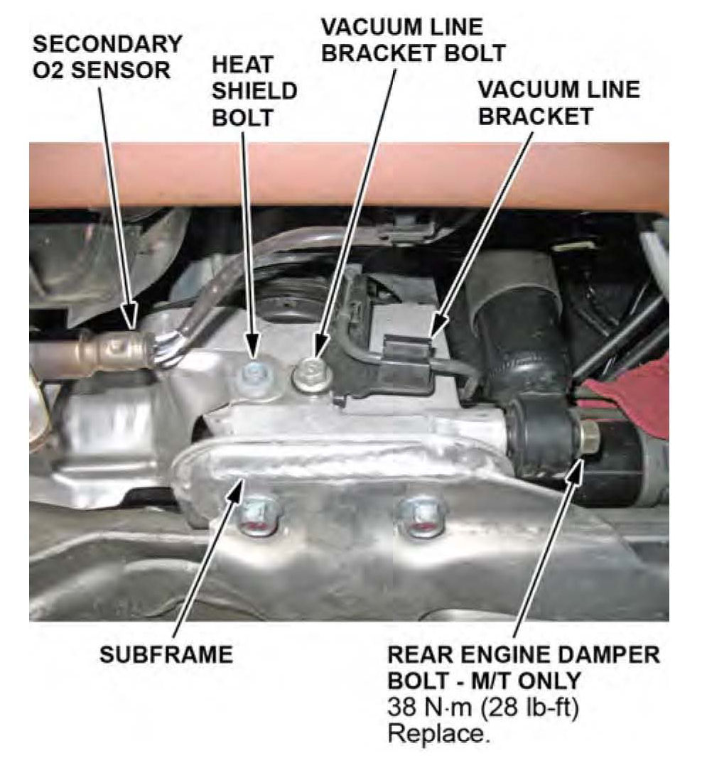 21. Remove the heat shield bolt from the front of the rear engine mount. The bolt is next to the secondary 02 sensor (bank 1, sensor 2).