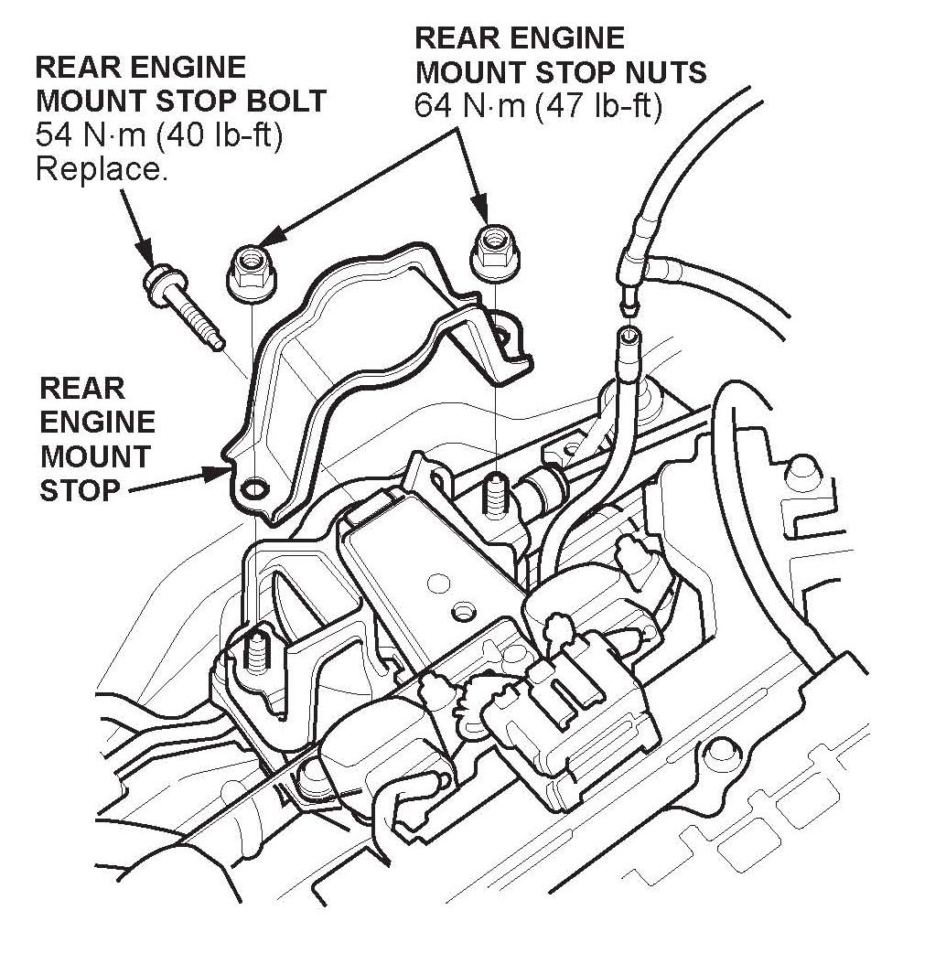 22. Remove the rear engine mount stop (two nuts), then remove the rear engine mount stop bolt. The stop bolt will not be reused.