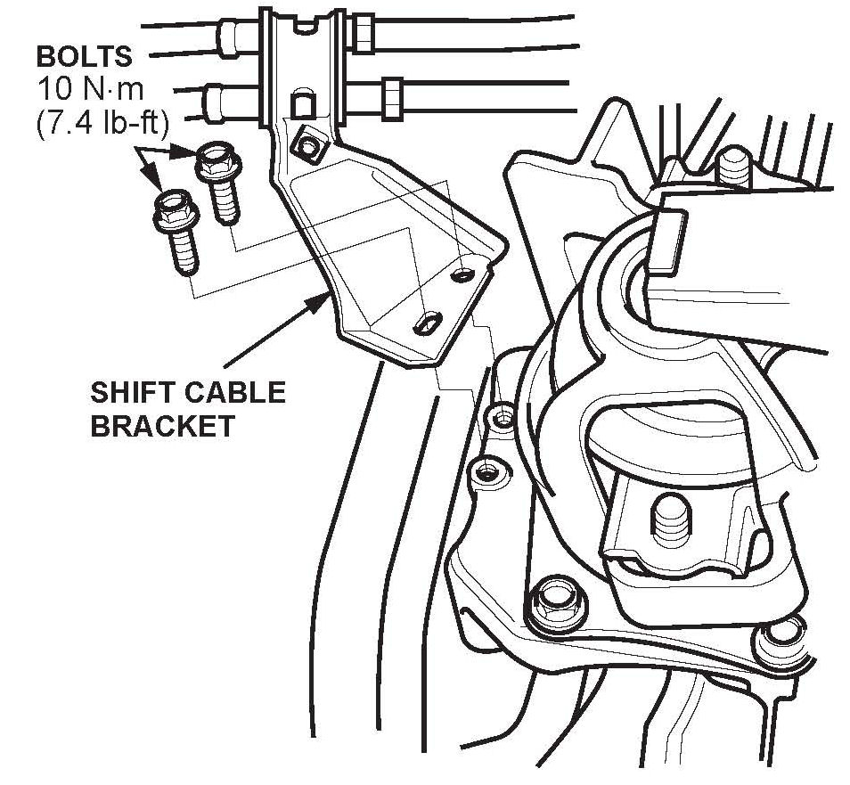 48. M/T models only: Reinstall the shift cable bracket. Torque the bolts to 10 N.m (7.4 lb-ft).