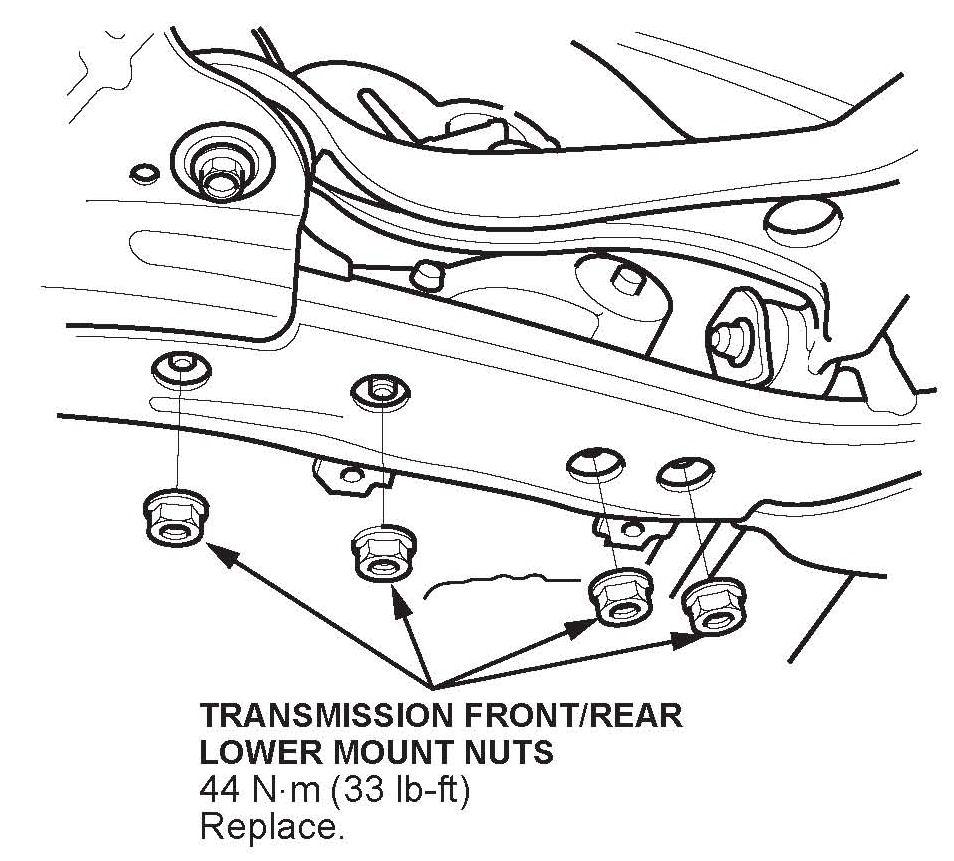 36. M/T models only: Install four new transmission front/rear lower mount nuts, and torque them to 44 N.m (33 lb-ft).