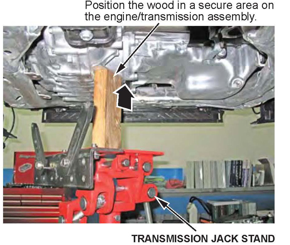 30. Using a transmission jack and a block of wood, position the wood in a secure area on the engine / transmission assembly, then slightly lift the assembly.