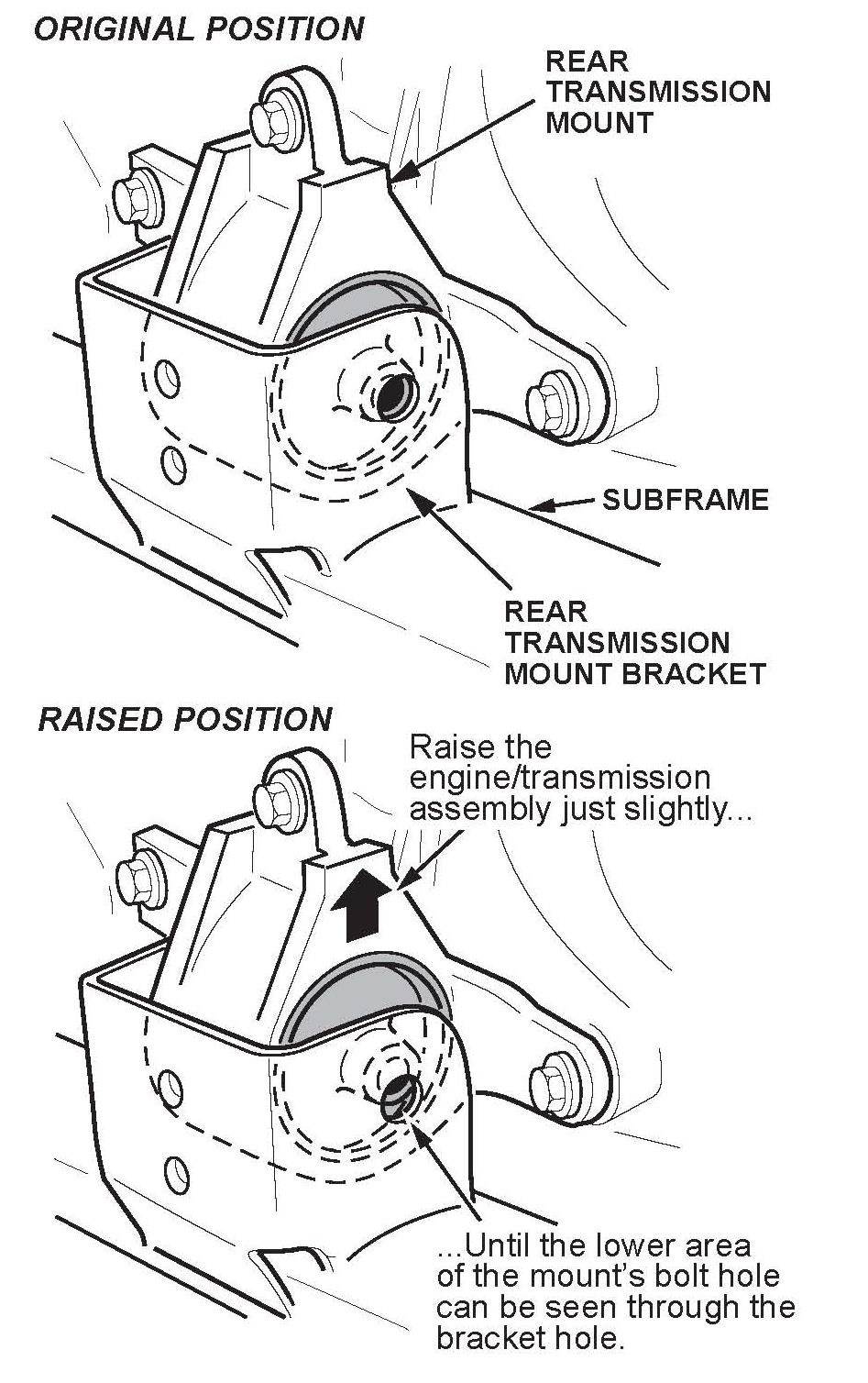 ^ A/T models only: The maximum allowable lift is reached when you see the lower part of the mount's bolt hole through the bracket hole (see below).