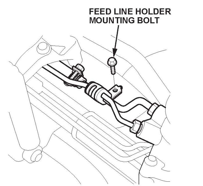 9. Remove the feed line holder mounting bolt from the front suspension subframe that is located on the driver's side. Remove the holder from both the feed and return lines because it will not be reused.
