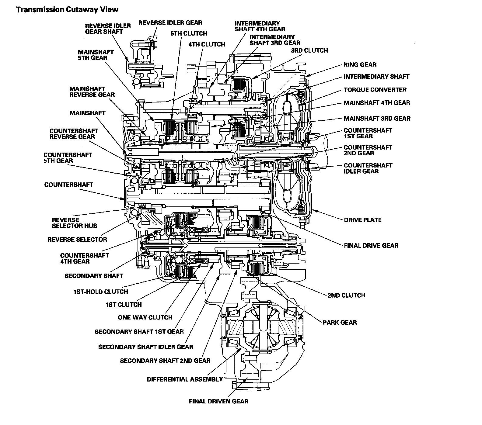 The one-way clutch is positioned between the 1st clutch hub and the secondary shaft 1st gear. The secondary shaft 1st gear is splined to the 1st-hold clutch hub, with the 1st-hold clutch hub splined to the secondary shaft. The secondary shaft 1st gear provides the outer race surface, and the 1st clutch hub provides the inner race surface. The one-way clutch locks when power is transmitted from the secondary shaft 1st gear to the countershaft 1st gear. The 1st clutch and gears remain engaged in the 1st, 2nd, 3rd, 4th, and 5th gear ranges in D or L. However, the one-way clutch disengages when the 2nd, 3rd, 4th, or 5th clutches and gears are applied in D or L. This is because the increased rotational speed of the gears on the secondary shaft causes the one-way clutch to free-wheel with the 1st clutch still engaged.