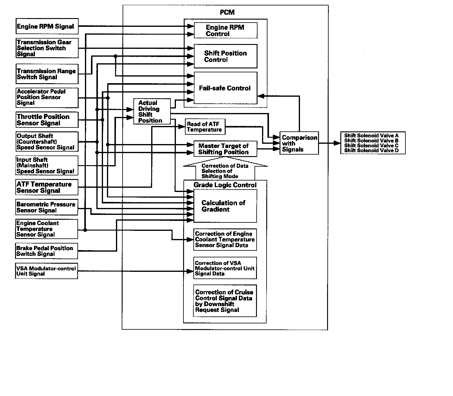 The PCM instantly determines which gear should be selected by various signals sent from sensors and switches, and it actuates shift solenoid valves A, B, C, and D to control gear selection.