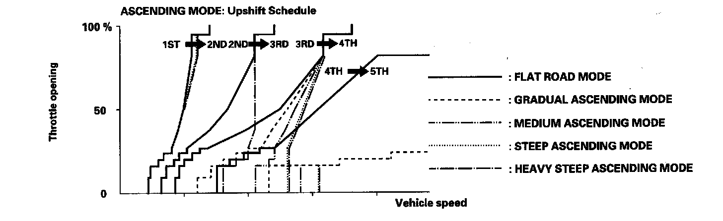 When the PCM determines that the vehicle is going down a hill in D, the shift-up speed from 4th to 5th gear, 3rd to 4th gear, and from 2nd to 3rd (when the throttle is closed) becomes faster than the set speed for flat road driving to extend the 4th gear, 3rd gear, and 2nd gear driving areas. This, in combination with engine braking from the deceleration lock-up, achieves smooth driving when the vehicle is descending. There are three descending modes with different 4th gear driving areas, 3rd gear driving areas, and 2nd gear driving areas according to the magnitude of a gradient stored in the PCM. When the vehicle is in 5th or 4th gear and you are decelerating while applying the brakes on a steep hill, the transmission will downshift to a lower gear. When you accelerate, the transmission will then return to a higher gear.