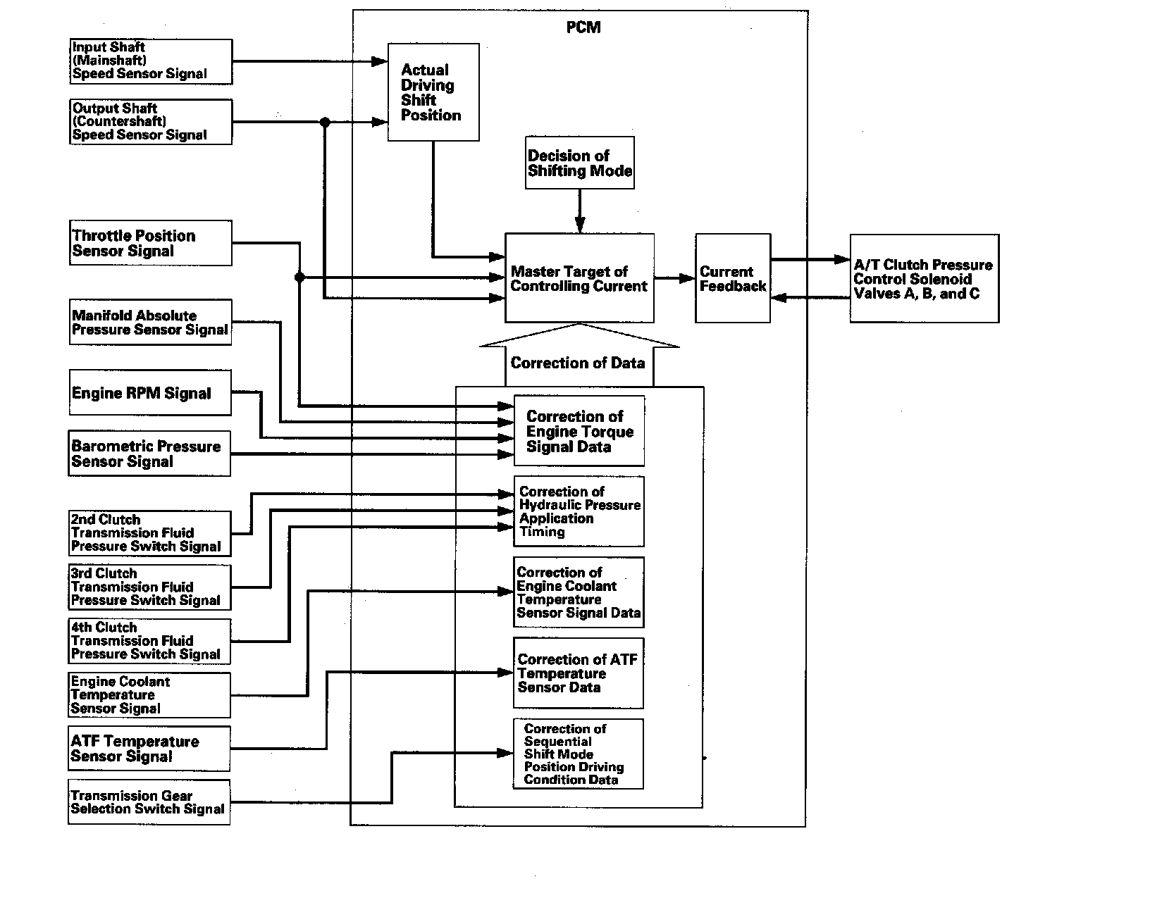 The PCM receives input signals from the various sensors and switches, performs processing data, and outputs current to A/T clutch pressure control solenoid valves A, B, and C.