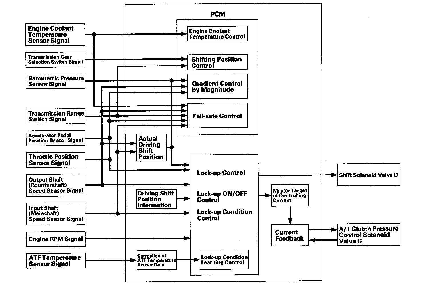 The PCM receives input signals from the sensors, switches, and other control units, processes data, and outputs signals for the engine control system and A/T control system. The A/T control system includes shift control, grade logic control, clutch pressure control, and lock-up control. The PCM switches the shift solenoid valves and the A/T clutch pressure control solenoid valves to control gear selection and lock-up torque converter clutch.