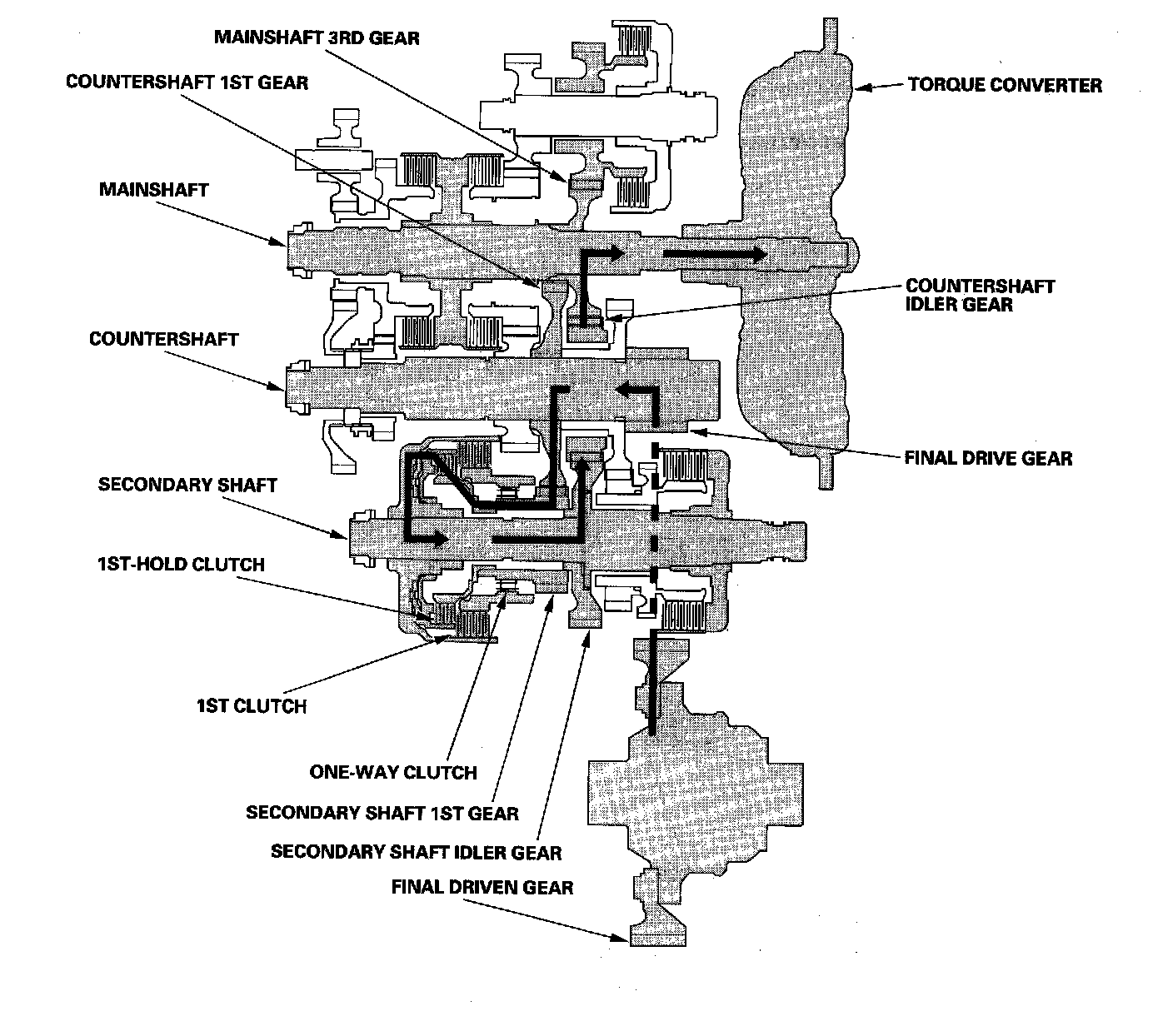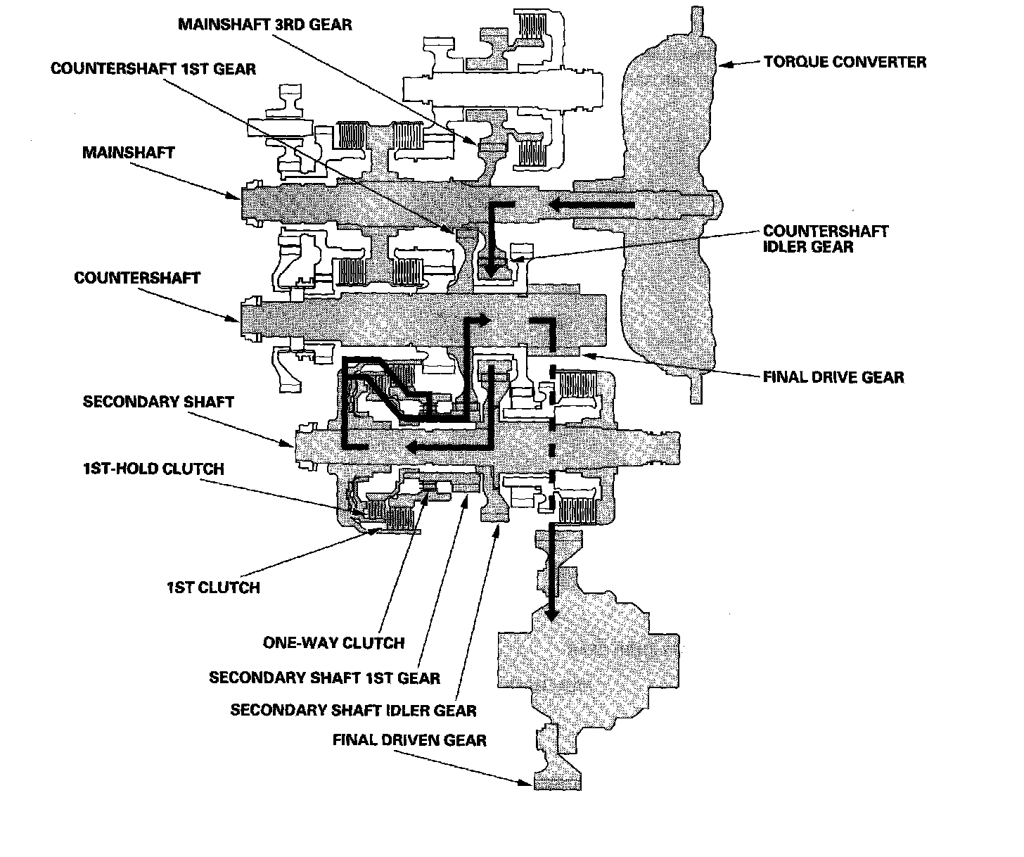 ^ Hydraulic pressure is also applied to the 1st-hold clutch, and the 1st-hold clutch engages the secondary shaft 1st gear with the secondary shaft.