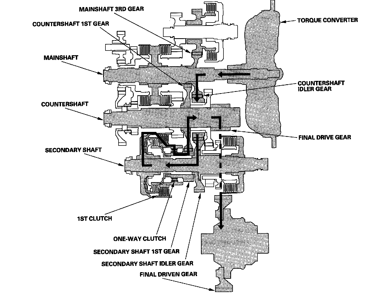 ^ Hydraulic pressure is applied to the 1st clutch, then the 1st clutch engages the secondary shaft 1st gear with the secondary shaft by the one-way clutch.