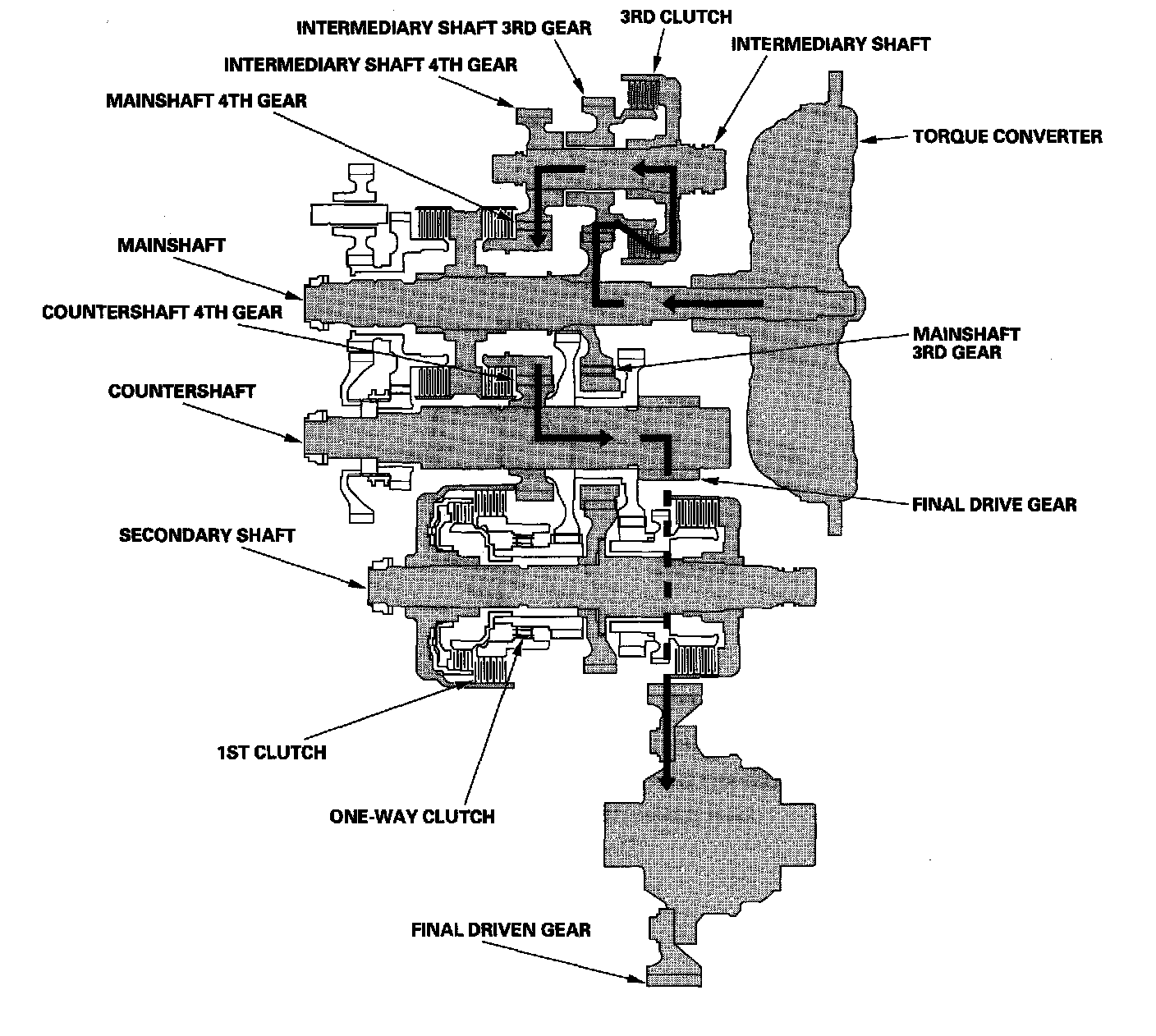 ^ Hydraulic pressure is applied to the 3rd clutch, then the 3rd clutch engages the intermediary shaft 3rd gear with the intermediary shaft.