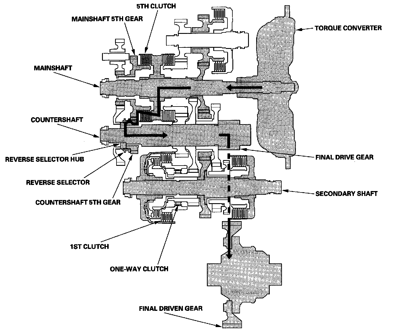 ^ Hydraulic pressure is applied to the 5th clutch, then the 5th clutch engages the mainshaft 5th gear with the mainshaft.