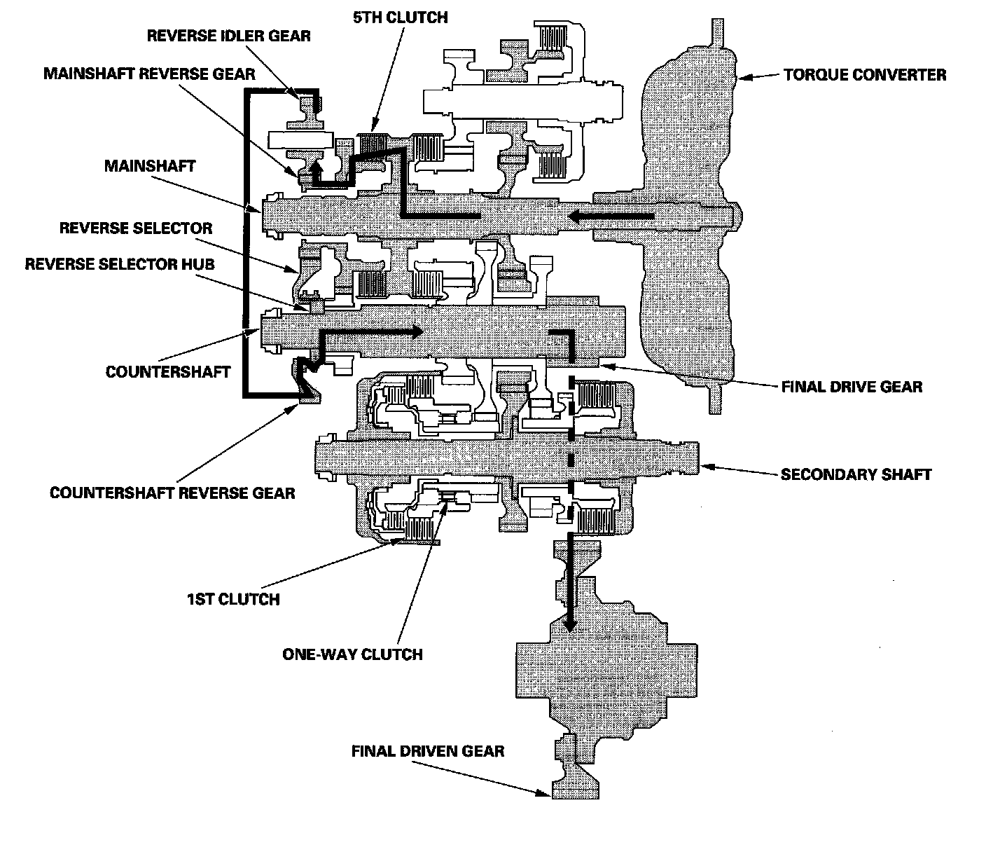 ^ Hydraulic pressure is applied to the 5th clutch, then the 5th clutch engages the mainshaft reverse gear with the mainshaft.