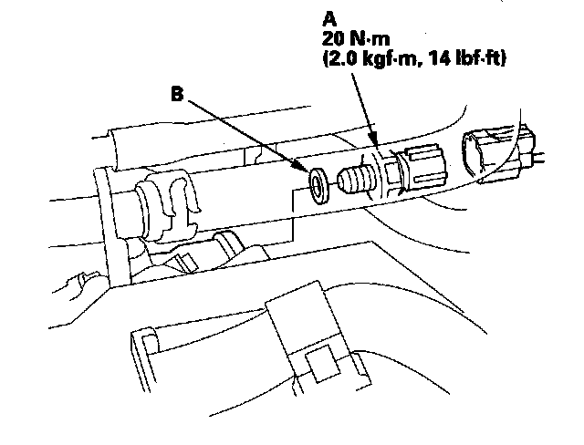 7. Disconnect the 2nd clutch transmission fluid pressure switch connector, and remove the 2nd clutch transmission fluid pressure switch (A) and the sealing washer (B).