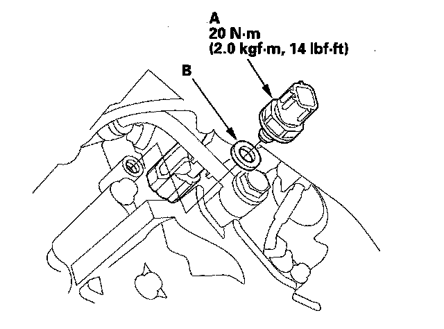 2. Disconnect the 3rd clutch transmission fluid pressure switch connector, and remove the 3rd clutch transmission fluid pressure switch (A) and the sealing washer (B).