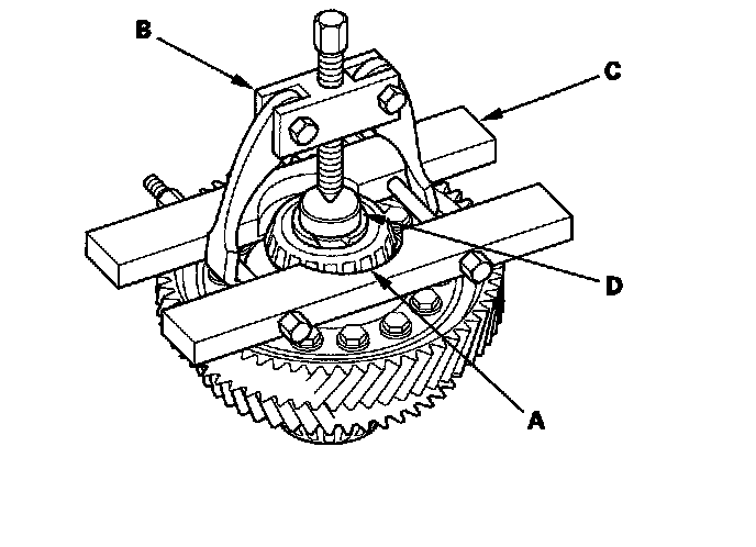 1. Remove the carrier bearing (A) with a commercially available bearing puller (B), the bearing separator (C), and the stepper adapter (D).