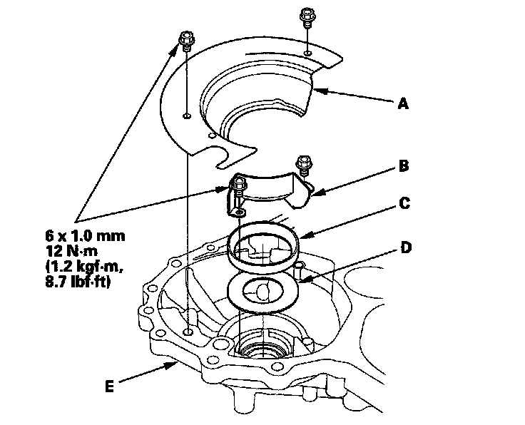 4. Remove the baffle plates (A) (B), and remove the bearing outer race (C) and the spacer (D) from the torque converter housing (E).