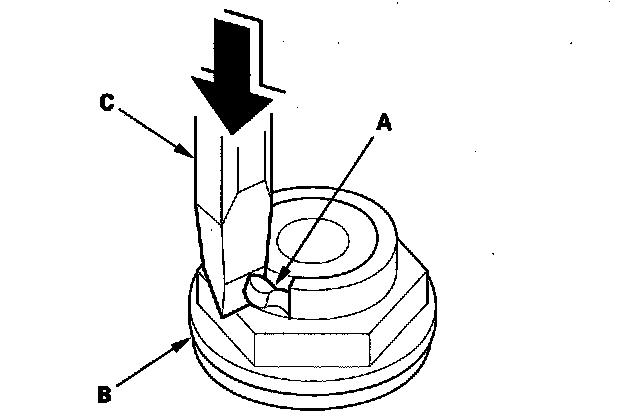 19. Cut the lock tab (A) of the mainshaft locknut (B) using a chisel (C).